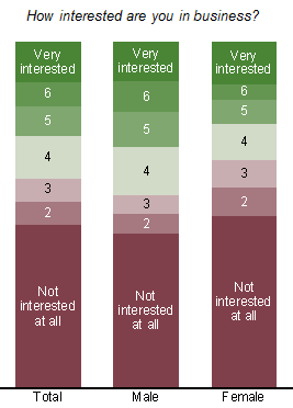 Now that’s more like it. Once again, it looks like overall no one is that interested in business (40% totally uninterested overall!), but this time round women are actually even more interested than men in business, so pipe down misogynists. What is really going on here? It turns out that the problem was that our sample contained a disproportionate number of older women, and age is actually the area where you start to see differences between respondents: